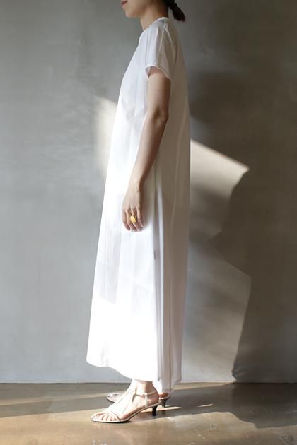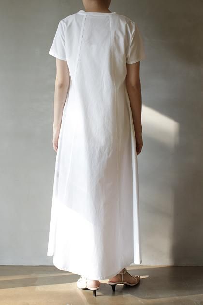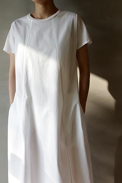 放射状に生地を切り替えたAラインシルエットが綺麗なシャツ生地ドレス。首元はソフトなコットンリブ。