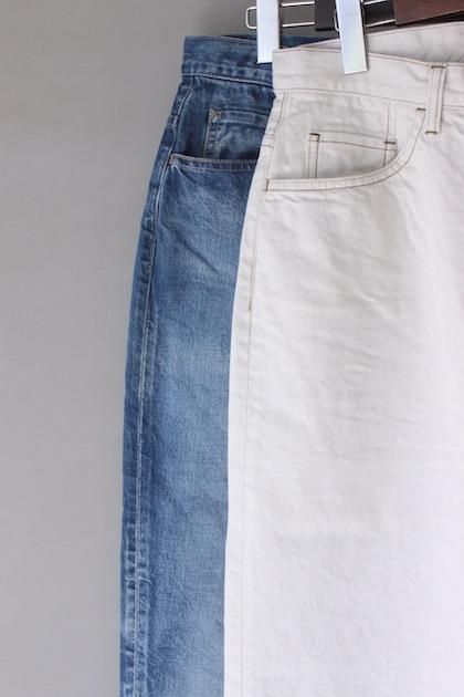 生成りにはダークベージュ、インディゴにはグレーの横糸を使用しているので色に深みが出ています。テーパードの効いたシルエットが特徴のデニムパンツです。