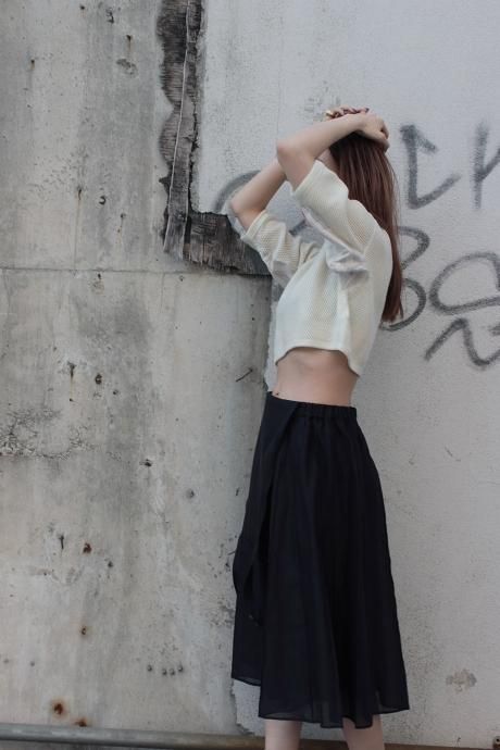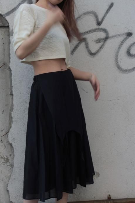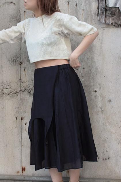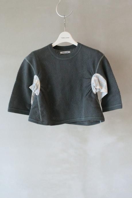 ウール素材のメッシュ生地とストライプフランネルで作る5分袖サーマルカットソー。メッシュ生地は太さに対し軽く仕上がるウール糸を使ったラッセル編みで、メッシュ組織でも落ち感が出過ぎない素材。脇下のマチに使用したフランネル生地はピッチの異なる2色のストライプ柄でインサイドに微起毛をかけた仕上げで暖かく柔らかい肌あたりのオリジナル。縮んで小さくなった洋服の身幅を広げるためにマチをつけ、直して着る古い時代のホームリペアの雰囲気を持たせたデザイン。オーバーショルバーから股下にマチがついたゆとりある袖は肘上丈。ゆとりある身幅から少し広がり歪んだ裾は体から浮く幅でウエスト丈。製品加工のため、色差で生地の表情やサイズに違いが出るがデザイン上の特性と捉えた服。
