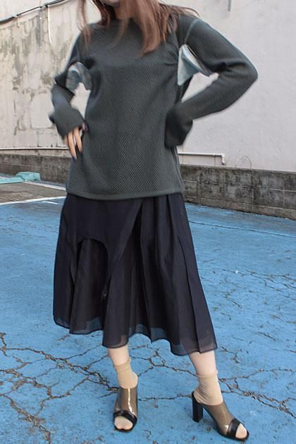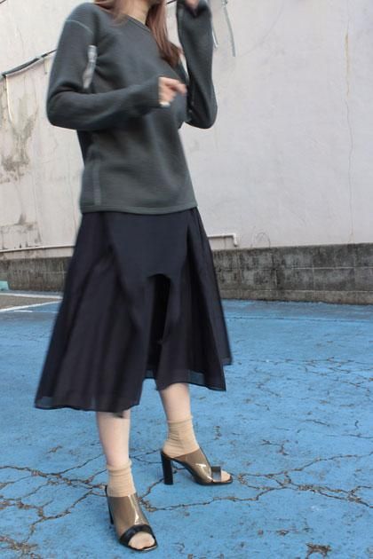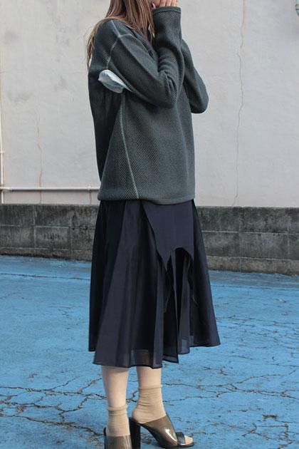 ウール素材のメッシュ生地とストライプフランネルで作るロングスリーブサーマルカットソー。メッシュ生地は太さに対し軽く仕上がるウール糸を使ったラッセル編みで、メッシュ組織でも落ち感が出過ぎない素材。脇下のマチに使用したフランネル生地はピッチの異なる2色のストライプ柄でインサイドに微起毛をかけた仕上げで暖かく柔らかい肌あたりのオリジナル。縮んで小さくなった洋服の身幅を広げるためにマチをつけ、直して着る古い時代のホームリペアの雰囲気を持たせたデザイン。オーバーショルバーから股下にマチがついたゆとりある手の甲の真ん中までの袖丈。ゆとりある身幅に付くマチは縮んだようにギャザーの入ったディテールで、裾は歪んだアウトラインのヒップ丈。製品加工のため、色差で生地の表情やサイズに違いが出るがデザイン上の特性と捉えた服。