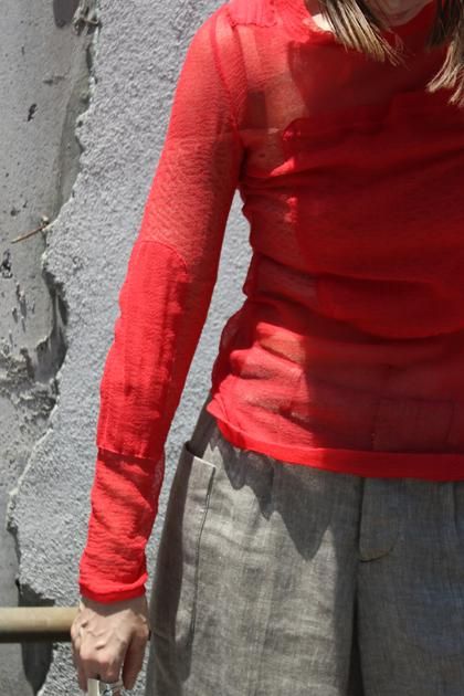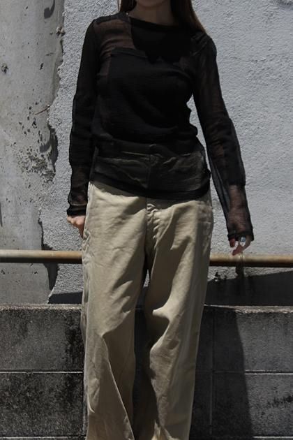 前後に付く大きいポケット、肩位置のパッドなどミリタリーのディティールデザインをガーゼのような中性的な肌の透け方のするカラミで作るロングスリーブトップス。ジャストショルダーで直線的なシルエットのヒップ丈。ストレッチ性のあるシルクコットンの糸をカラミ織機(蚊帳などを織る)を使った繊維な織物をカットソーのように仕立てる。チュールとは違ったガーゼのような中性的な透け方。