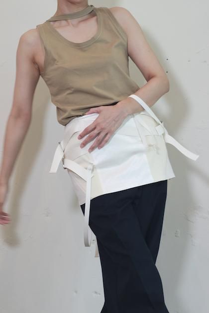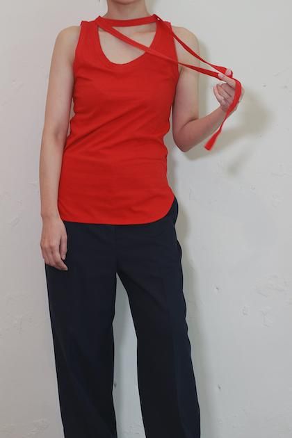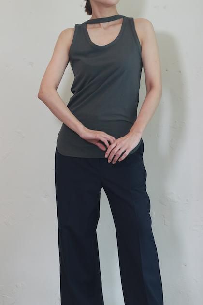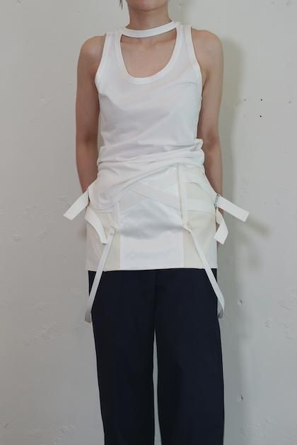首元にフライステープが付くダブルネックデザインの天竺素材のタンクトップ。キックバックのない素材で体に隙間を作りながらバストとヒップでフィットするシルエットのヒップ丈。左右で生地の地の目の使い方を変えたフライステープが背中で輪で繋がる。首の前後に自由に垂らして形作るディテール。オーガニックコットンを使用し度目を詰めて編み立てた天竺素材は洗い込んでも毛羽立ちが少なく風合いが損なわれないオリジナルのカットソー生地。左右の裾にスリット。
