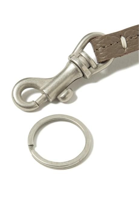 長いレザーストラップのキーリング。腰元やバッグに取り付けるだけでスタイリングのアクセントとして重宝します。鍵を束ねる2重カン、腰元やバッグにつける重厚感のあるナスカンを装備。柔らかなカウレザーはシュリンク加工によってシボ感を強めたもの。モチモチした感触と手に優しく馴染み、表面にシボ加工を施しているので傷の目立ちにくいのが特徴です。