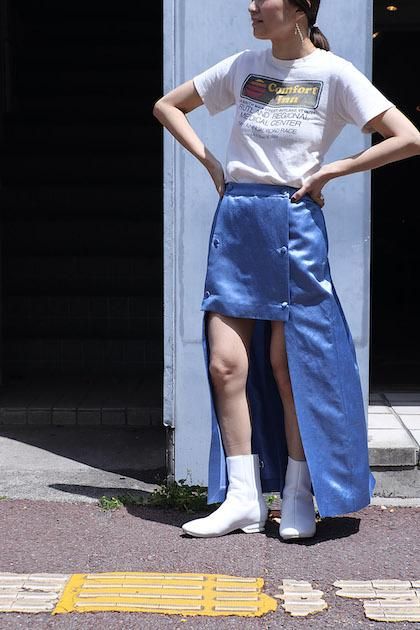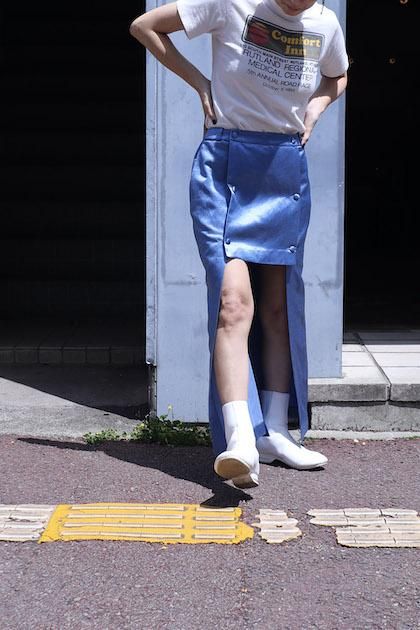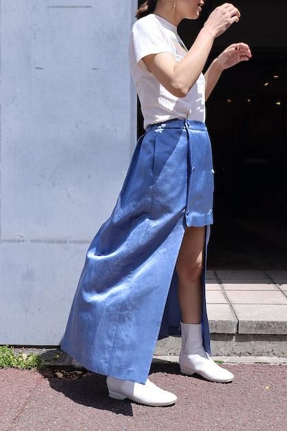 シルクリネンのサテン素材に生地加工を入れ、貝のような層が重なった凸凹のある表情と横張り感のある生地を使用したスコート。古い時代のライディングパンツディテールからのインスパイアで一見スカートのように見えるが、内側がパンツになっている構造。フロントからは台形型の長さの異なるスカートを重ねているような見え方。後ろは3タックでヒップにボリュームのあるシルエット。ミドルウエスト履きで、太もも丈のフロント左右につくドットボタンと、右側ドット奥につくファスナーで開閉、着脱。YKKファスナーを使用。