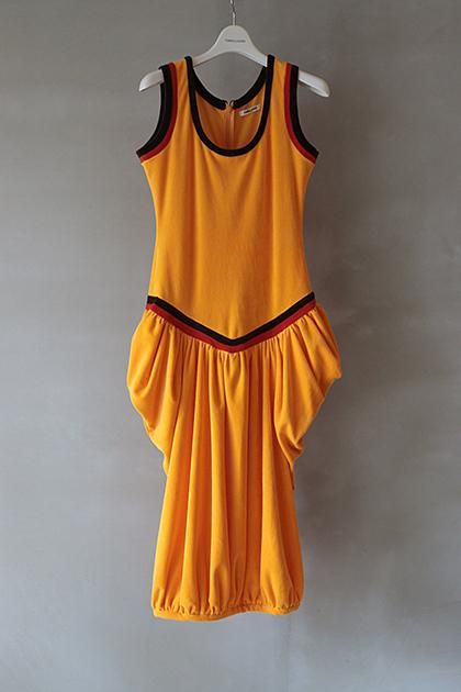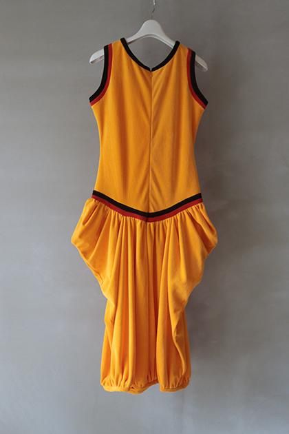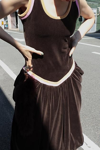 ポジティブなカラーでのトリミングが印象的なワンピースです。ローウエスト切り替えで力を抜いたバランスにデザインしています。密度のある毛足で程よい厚みのコットンベロアで立体感のあるバルーンなシルエットです。