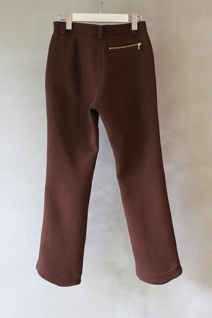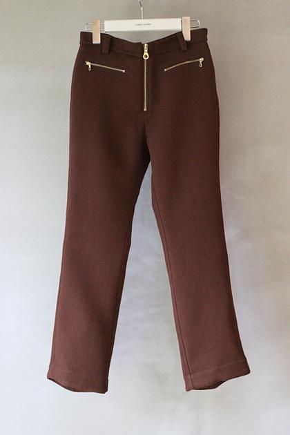 2016AW使用素材を継続。2016AW時にはリバー縫製で展開したアイテムを通常の縫製で作成。体に沿う腰回りから膝でくびれ、裾につながる立体的なフレアシルエットで2016AW時よりサイズ感を大きく修正しています。後丈が若干長いヘムラインはスキーウェアからのインスパイアで、ヒールにも併せやすいラインです。前回よりポケットはファスナー使いに変更し、よりシャープな印象に仕上げたアイテム。ファスナーはririファスナーを使用。