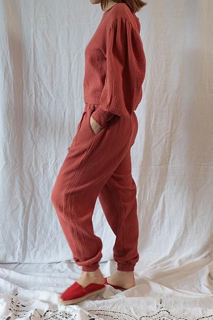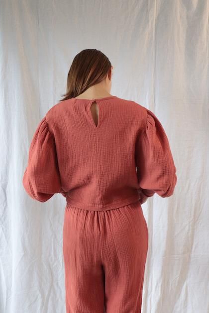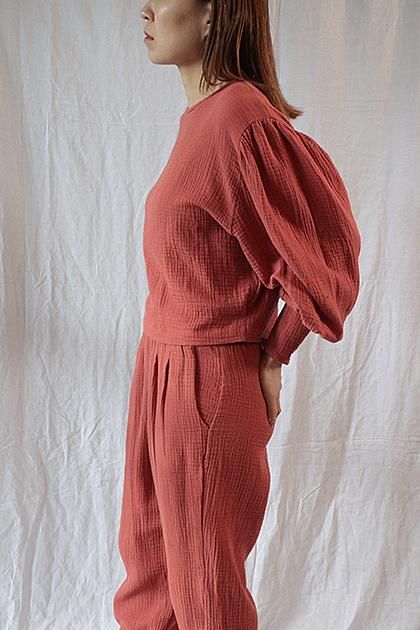 発色の綺麗なコットン生地を使用したトップス。コンパクトな仕上がりで袖も程よいボリュームだがサラッと着れてどの色とセットアップで組み合わせても相性が良い3色をチョイス。身頃の裾はテーパードされており、おさまりの良いデザイン。"Rosy"は腕のいいパタンナーさんの名前から付けられています。