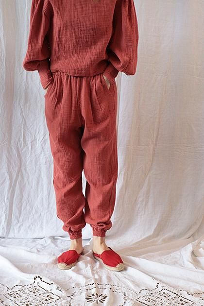 発色の綺麗なコットン生地を使用したトップス。コンパクトな仕上がりで袖も程よいボリュームだがサラッと着れてどの色とセットアップで組み合わせても相性が良い3色をチョイス。身頃の裾はテーパードされており、おさまりの良いデザイン。"Rosy"は腕のいいパタンナーさんの名前から付けられています。