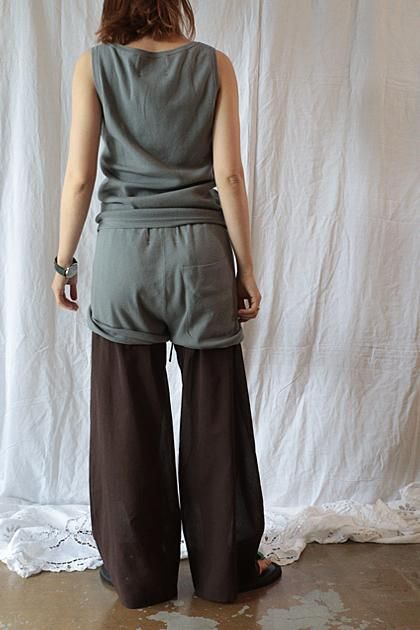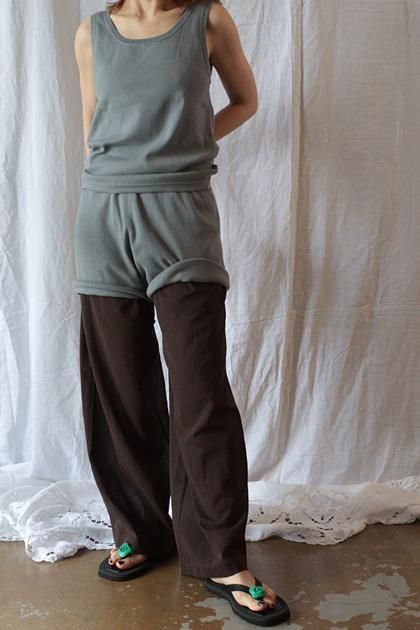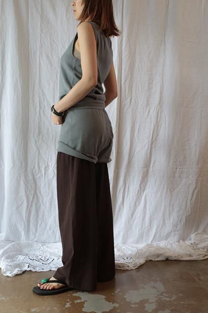 ラウンドに広めに開いたタンクトップ。ネック、脇周り、裾はリブ。ミニマルなデザインの1枚です。