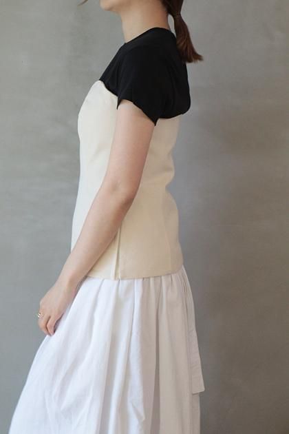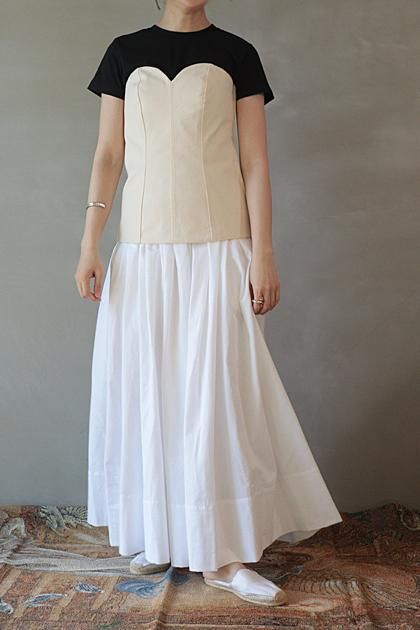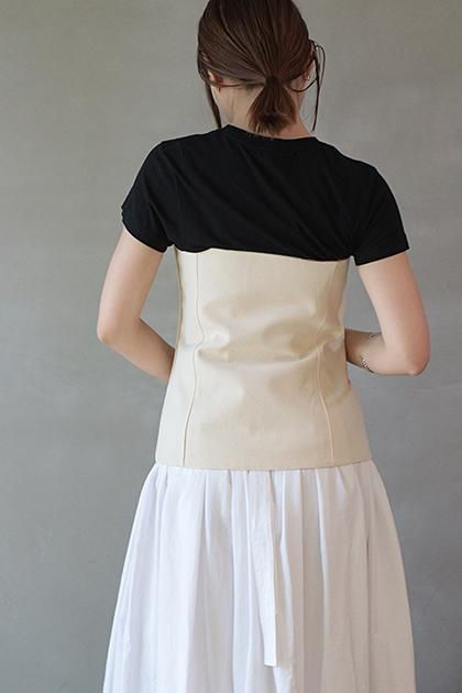 キャンバス地を立体的に組み合わせたコルセット。ハリのある素材がポイント。素材感の違いや色合いなどを重ねて楽しめるアイテムです。Mayaはプレヒスパニック時代のイメージを尊重しピュアな白はMayaのシンボルカラー。サイドジップが全開して着脱可能。