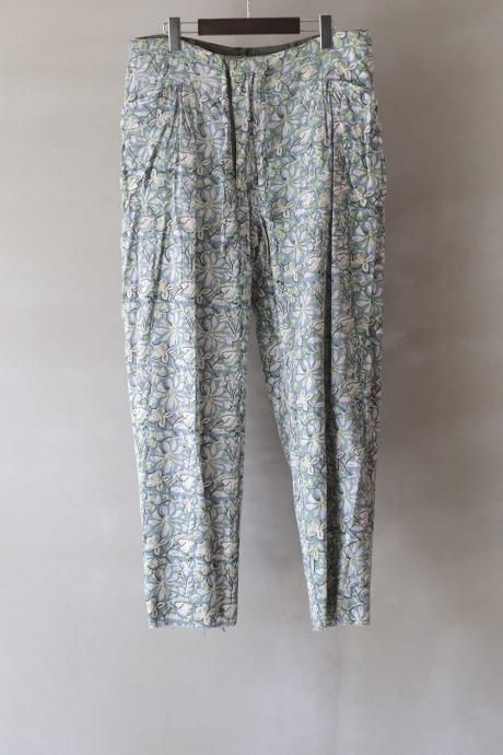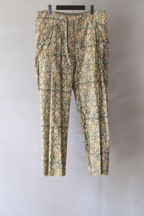 NNインド生産ラインMADE BY HANDシリーズ。型は1930〜40sのUKビスポークスラックスの仕様を取り入れながら新解釈にて製作したイージースラックス。脇のダーツやウエスト周りのタックの取り方などにより膨らみのあるテーパードシルエットに。完全リバーシブル仕様。ブロックプリントパンツとしての着用も可能です。生地はタテ糸もヨコ糸も2色の糸を手で最大限に撚り上げ作り上げた機械織りの強撚シルク生地。不揃いなシルク糸の太さとランダムな2色の糸が魅力。裏地や芯地に日本とインドでのみ生息する花を掛け合わせたオリジナルのブロックプリント生地を使用。