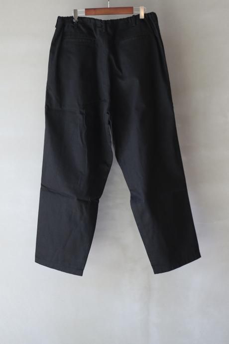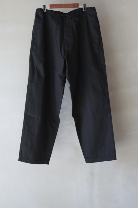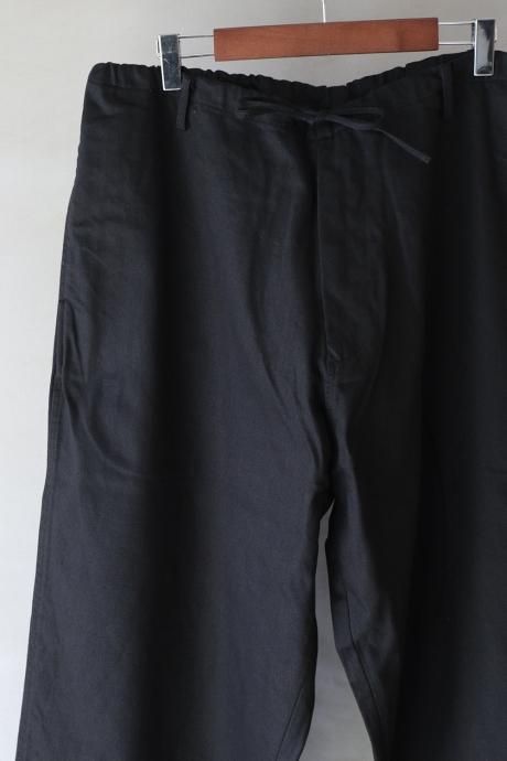 ワイドテーパードシルエット。ウエストは大きめでドローコードを使用して縛って履く想定。ベルトループも付属。