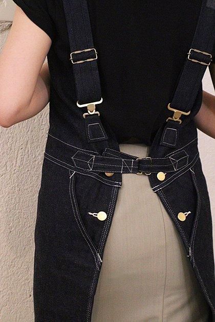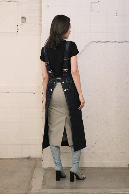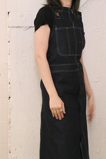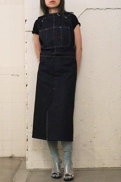 サンフォライズド(防縮加工)の10.2オンスの薄手のデニムを使用したエプロン型Iラインワンピース。大きいサイズのオーバーオールを前後ドッキングさせ、前から見たときにオーバーオールを着ているように見えるデザイン。オーバーオールのディテールで色っぽさのある着方ができないかという発想からデザインされています。