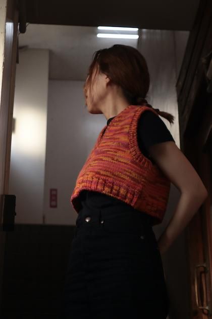 1本の糸に対して、複数(今回は4色)の色が繰り返されるように染める”段染め”という手法で作ったオリジナル糸を用いたニットベスト。手染め・手編みであるため、若干の個体差が生じることをご了承願います。