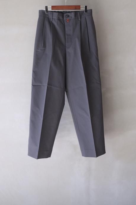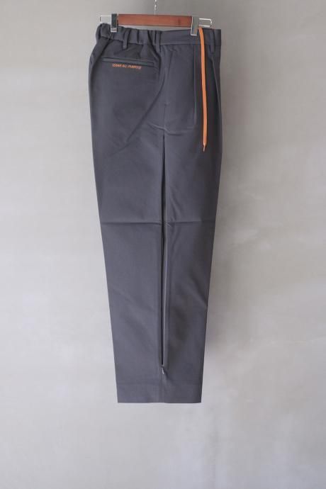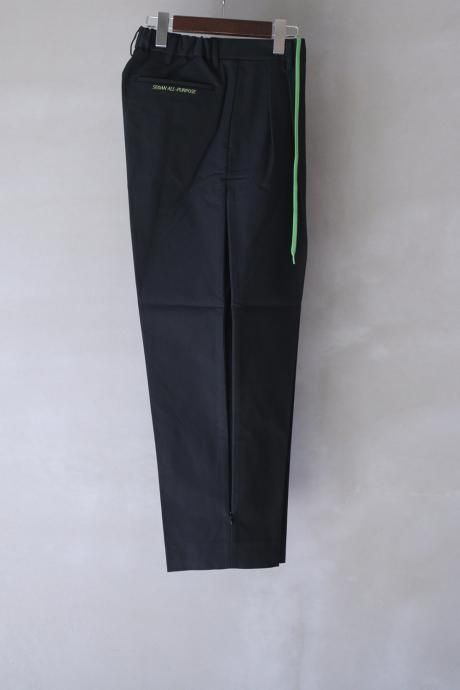 久しぶりにチノっぽいスラックスが履きたくなり、あれこれ素材を探しているとポリエステルでできた雰囲気のよいツイル生地を見つけた。しかもTACTEEM®という持続性撥水加工も施されているのでコーヒーをこぼしてしまったときにも安心。シルエットは2タック入りでややテーパードした一番履きやすいシルエット。ウエストの後ろ半分はゴムを入れて、紐もつくのでベルトレスでも履ける。ピンループ(ベルトを固定するためのループ)と紐は蛍光色で少し遊び心を加えつつ、脇のシーム部分にはファスナーで開閉できるメッシュのベンチレーション付き。かしこまったスラックスをちょっとだけカジュアルにしてくれる仕様です。なんとなく革靴よりもスニーカーやサンダルに合わせていただきたいスラックスですが、撥水するわ洗えるわでいろんな場面といろんな季節で使えると思います。ヒップポケット口にはロゴ刺繍入り。ポリエステル原料の半分くらいはリサイクル素材を使用しています。