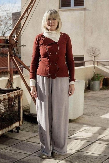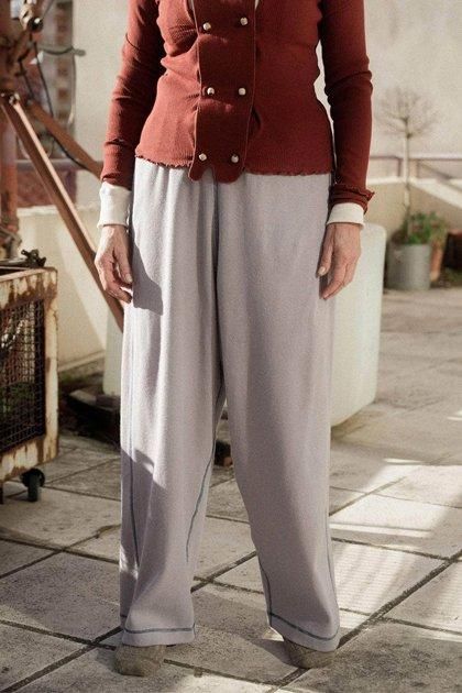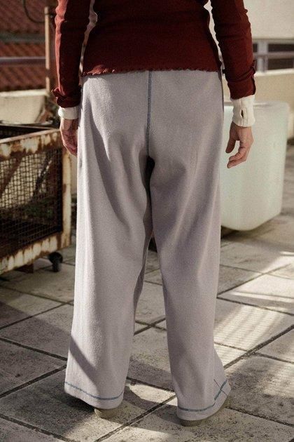 コットンリブ素材のパンツ。 コントラストが効いた縫い目がアクセントに。 ウエストゴム。