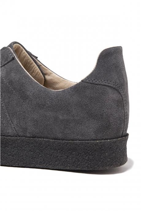 天然クレープソール仕様のモディファイドモデルです。アッパーのデザインは1980年代にドイツ軍でトレーニングシューズとして採用されていたスニーカーの通称《ジャーマントレーナー》になります。こちらをベースに軍用シューズを生産していたファクトリーに依頼し、現代的に再現をしています。つま先保護で付けられたトゥのカッティングが今やデザインとして確立されているキングオブミリタリースニーカーです。アッパーには上質なイタリアンスエードレザーを使用しています。ライニングとインソールにはピッグレザーを使用し、足あたりを良くしています。