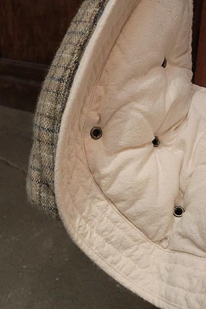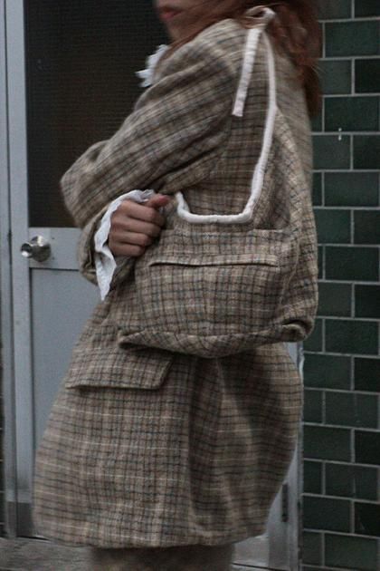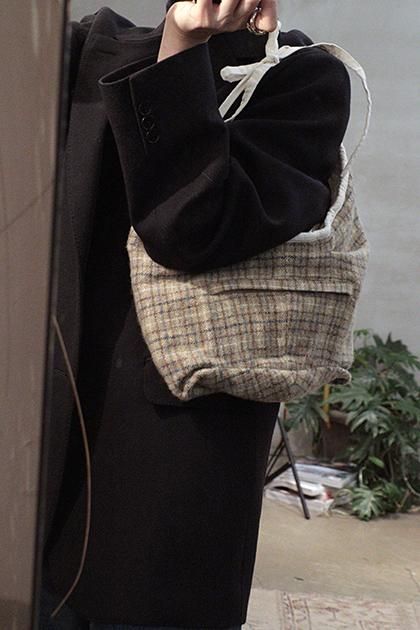 オリジナルのシェットランド糸を使って緩い密度で織られたチェック柄のツイードで作るウエストバッグ。ハイウエスト紐での着脱。バッグはファスナー開き。ウエストバッグの下に綿入りのバッスルクッションを重ねたデザイン。