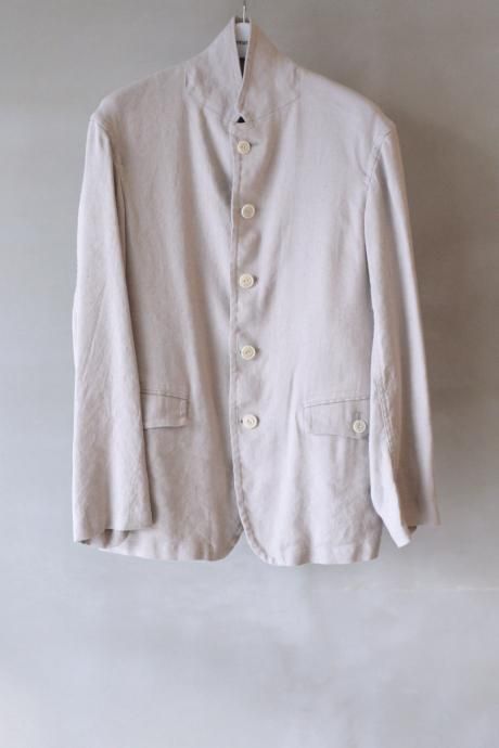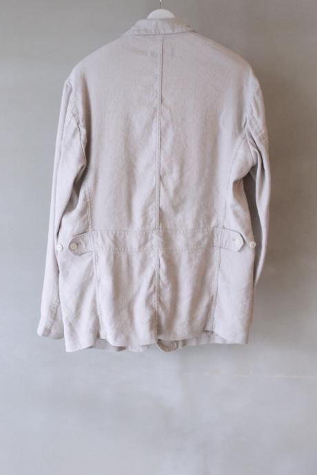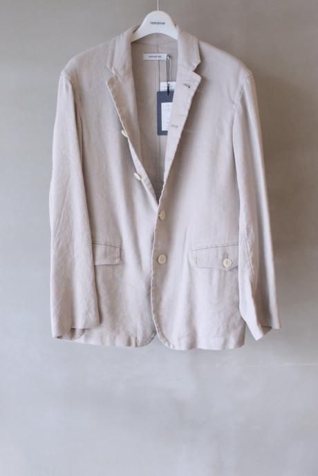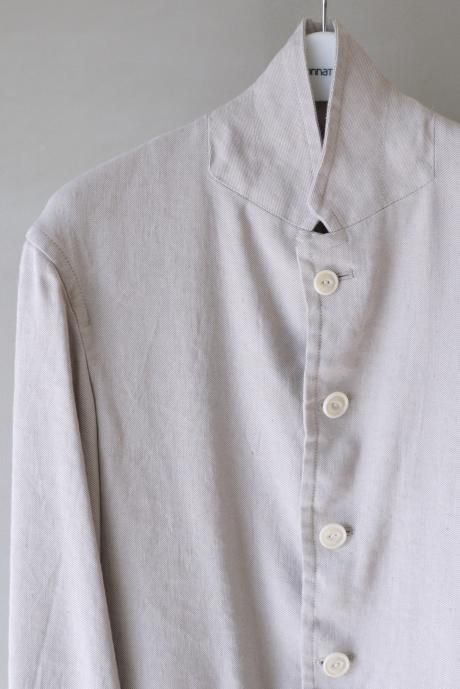 リネンアセテート混紡のツイル素材を使用した5つボタンのワークジャケットです。ラペルとボタンの調整でワークとテーラード、双方のスタイルでの着用が可能です。ミリタリージャケットのディティールを取り入れパッチポケットやウェストの調節ボタンなど、細かなデザインも特徴です。
