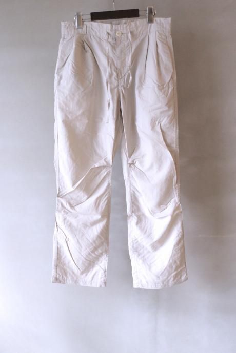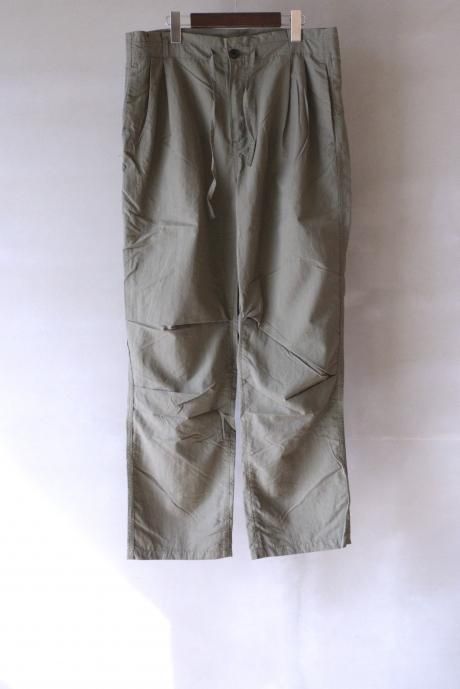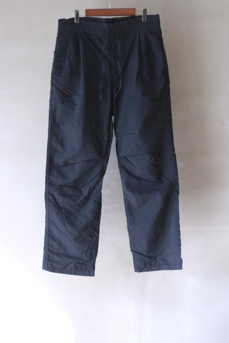 ナイロンウェザークロスのベーシックなイージーパンツです。深い股上、ツータック仕様と腰回りにゆとりを持たせたテーパードシルエットです。膝に入るダーツが構築的なシルエットを演出してくれます。