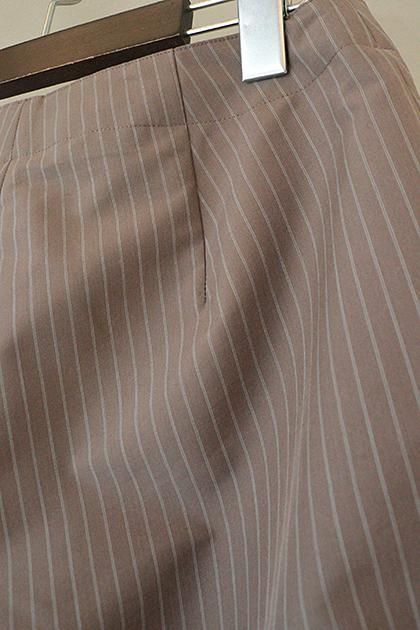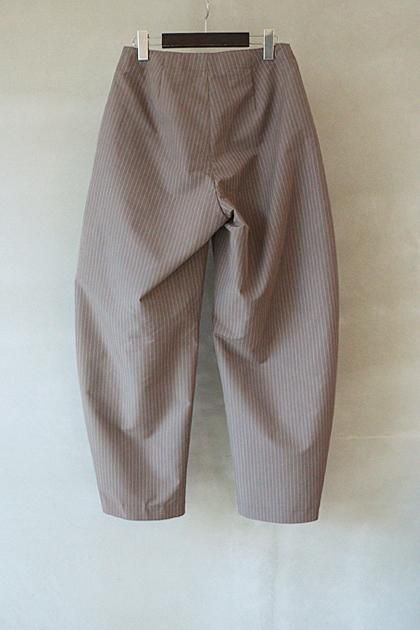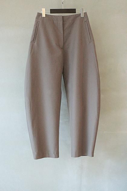 丸みのあるカーブとストライプ生地が特徴のスラックス。