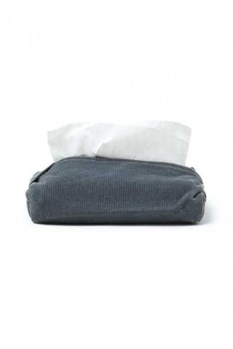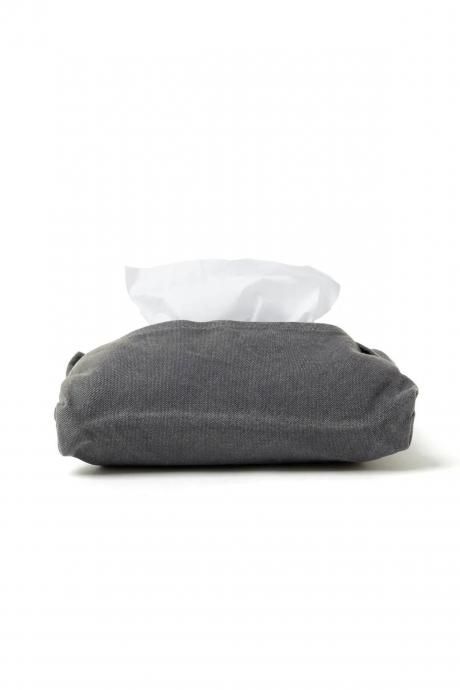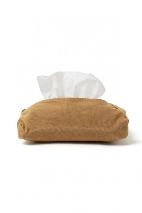 一枚仕立てで製作したティッシュケース。ねじりの入った口元が特徴のソフトパックティッシュを想定したデザインです。様々なシチュエーションにマッチし得る風合い豊かなキャンバス地を採用しています。
