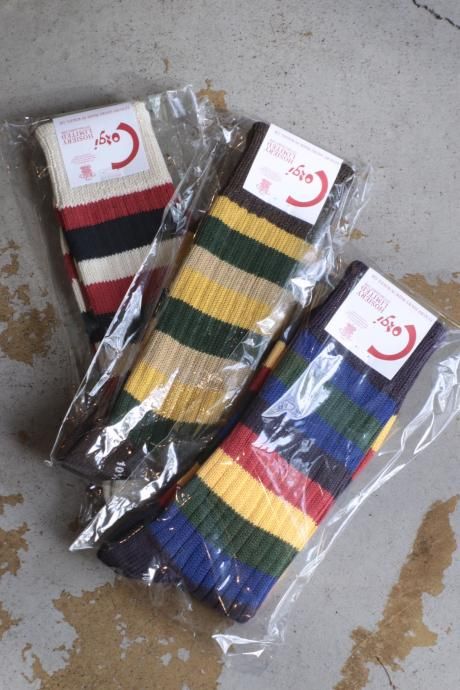 Corgi別注ソックス。 当時のDUFFERの広告でモデルが着用していたアームバンドのクレイジーボーダー柄をソックスに落とし込みました。