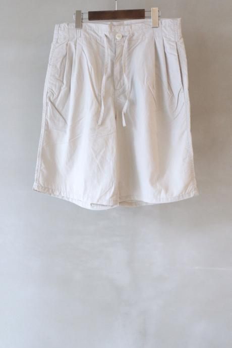 ナイロンウェザークロスのベーシックなイージーショーツです。深い股上、ツータック仕様と腰回りにゆとりを持たせたテーパードシルエットです。ウエストのアジャストがドローコードだけで完結するのでイージーに着脱ができます。