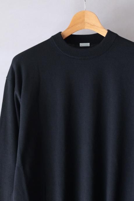 【 デ ザ イ ン 】カ ッ ト ソ ー の ロ ン T や ス ウ ェ ッ ト の 様 に カ ジ ュ ア ル に も 、ハ イ ゲ ー ジ ニ ッ ト の 様 に ク ロ ー ジングスタイルにも合わせることが出来るクルーネックニット 襟ぐりは狭くコンパクトな設計で袖口リブはターンナップ仕様 ゆったりさせているが、袖口と裾のリブをきつく提灯の様に編むことで綺麗なシルエットに設計