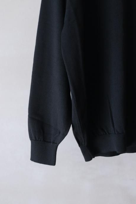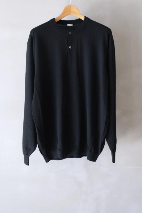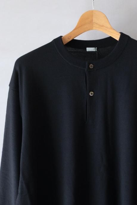 【デザイン】綺麗な丸い襟ぐりが特徴のヘンリーネックプルオーバー フロントオープンは2ボタン仕様で前立て幅は細め細幅に設定したリブ袖口のリブはシングル 全体的にゆったりとしているが、襟は程良く小ぶりなバランスに、袖口と裾のリブをきつく提灯の様 に編むことで綺麗なシルエットに設計