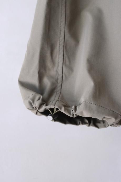 ポリエステル100%ながらコットンのようなタッチ感のリップストップ素材。軽量で耐久性のあるストレッチ生地。急な天候変化にも対応できる撥水加工。