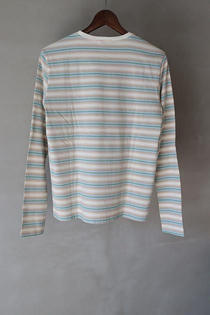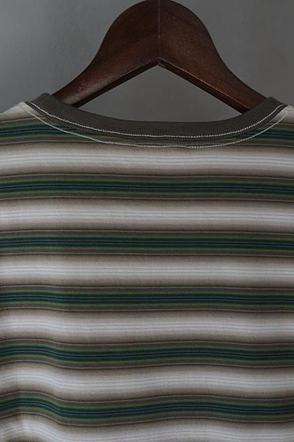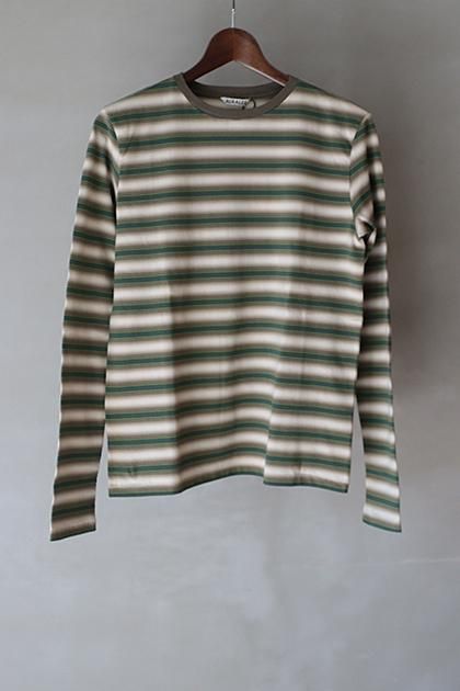 超ハイゲージ編み機を使用し、23色の色を使用したグラデーションボーダー天竺です。 豊かな色彩による深みのある美しい色味が特徴です。