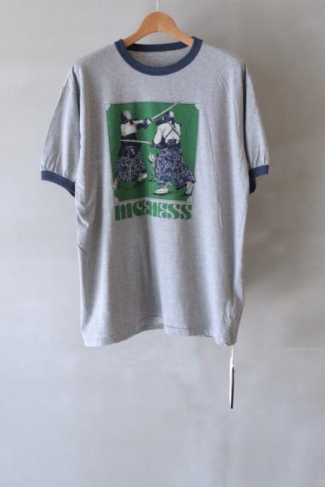 剣道をイメージして制作したオリジナル柄のデザインTシャツ。1980年代のヴィンテージスポーツTシャツをリファレンスとし、日本の精神文化を表す「道」の概念を 剣道の哲学になぞらえて表現しています。ボディはベーシックなコットン100%の天竺、 トリムは80年代のムードが漂う配色のバインダー仕様でオリジナルパターンのリンガーTeeです。当時のセールスマンサンプルTシャツのようにNNの革靴を剣道家の足元に取り入れ、袴の柄もNNオリジナル柄です。