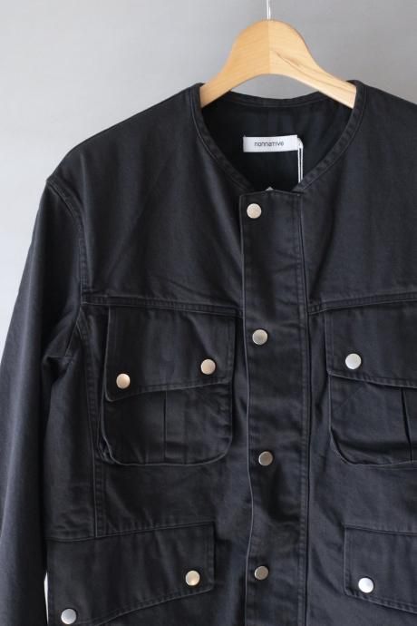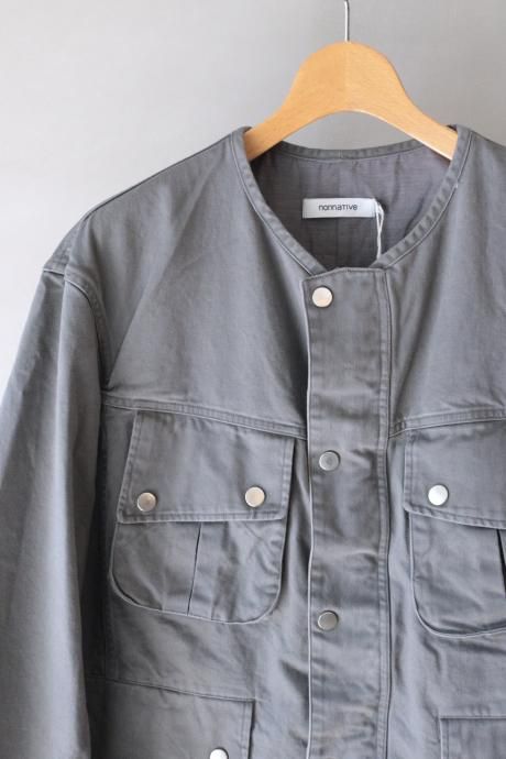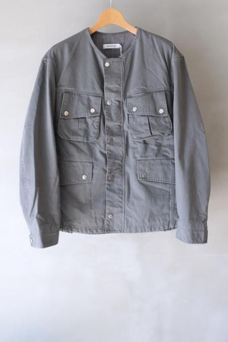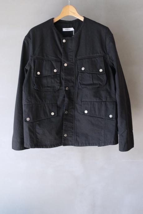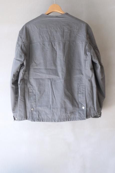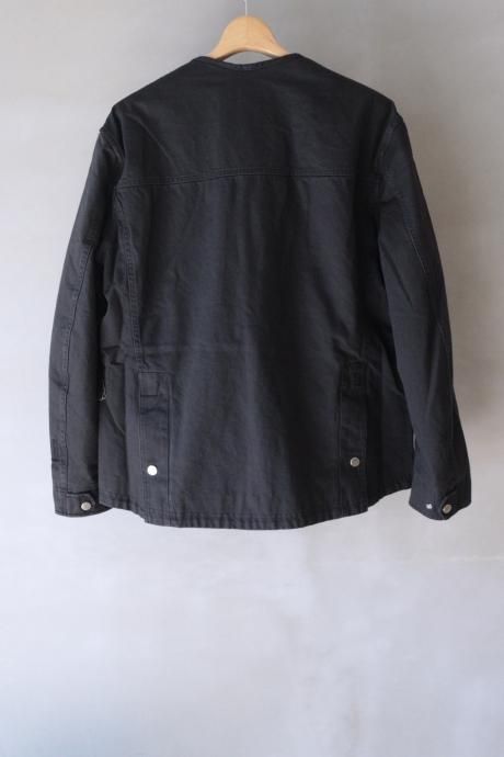 染色加工を施したコットンドリルを使用したモーターサイクルジャケットです。ノーカラー仕様や、ゆとりをもたせたやや丈の短いシルエットが特徴です。