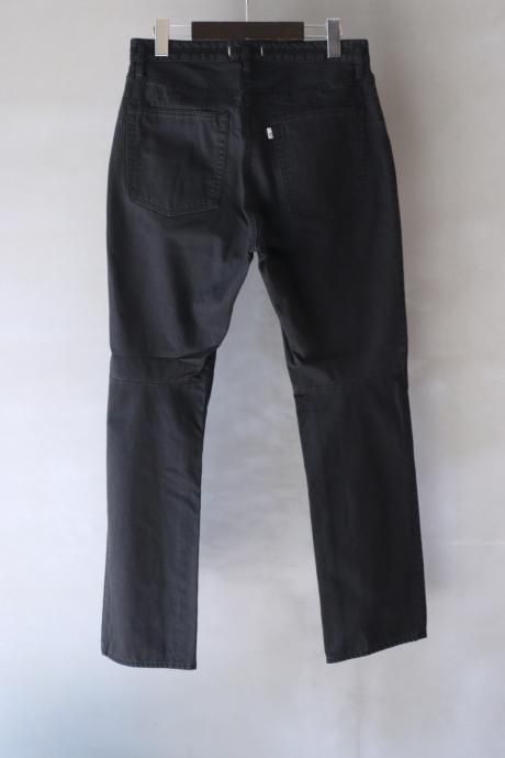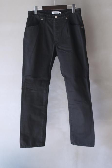 染色加工を施したコットンドリルを使用した5ポケットヘムジップジーンズです。フロント部分にタックを配し、腰回りにゆとりをもたせたリラックスシルエットが特徴で、裾にかけて緩やかにテーパードします。