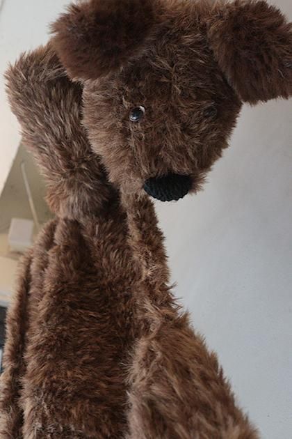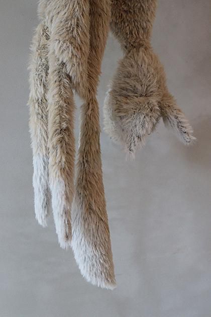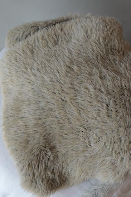FOXの毛のようなフェイクファーヤーンと、実際にFOXの毛を原料とした糸を引き揃えた素材で作るハンド網みぐるみマフラー。