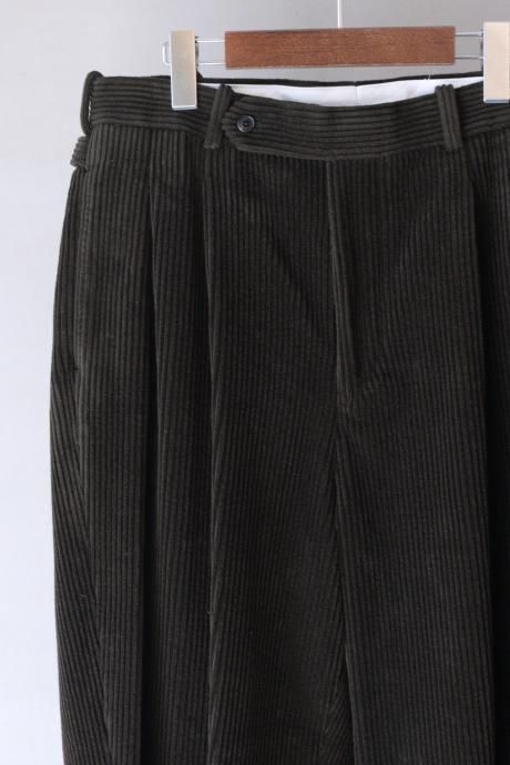 【 デザイン 】2プリーツのワイドテーパードトラウザーズ アウト2プリーツでサイドアジャスター付きの腰裏がマーベルト仕様の丁寧な作りのトラウザーズ 。