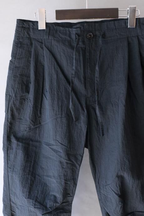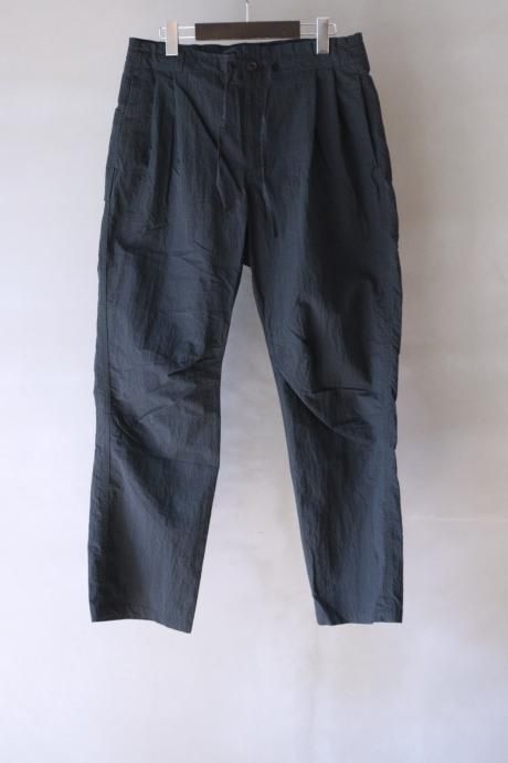 コットンナイロンウェザークロスを使用したイージーパンツです。腰回りに2つのタックを入れて、ゆとりを持たせたテーパードシルエットでが特緒です、膝横にダーツを設けているため、動きやすく綺麗なシルエットを描きます。