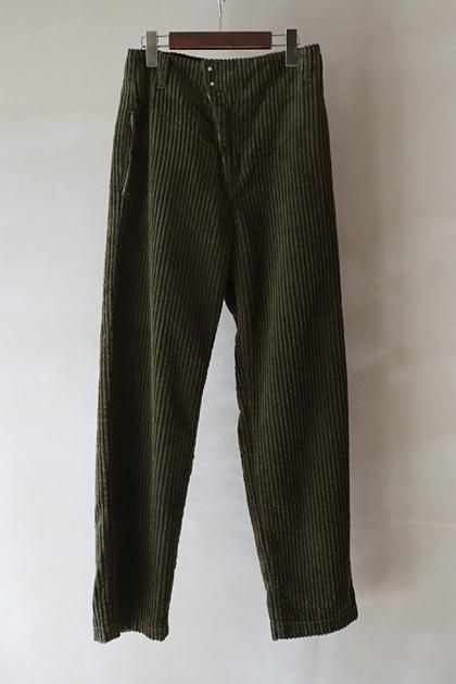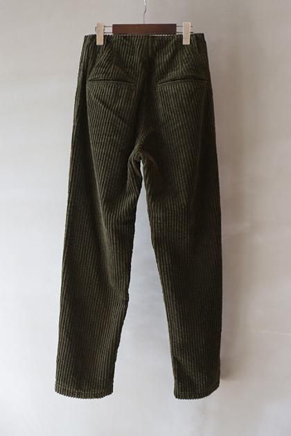 存在感のある太畝のコーデュロイを使った、すっきりとした印象のパンツ。生地はふっくらやわらかく、着心地は軽やか。ややテーパードした細身のシルエットで、シャープなバランスに。斜めに走るフロントラインとホック開きが、シンプルな中に個性を添えています。