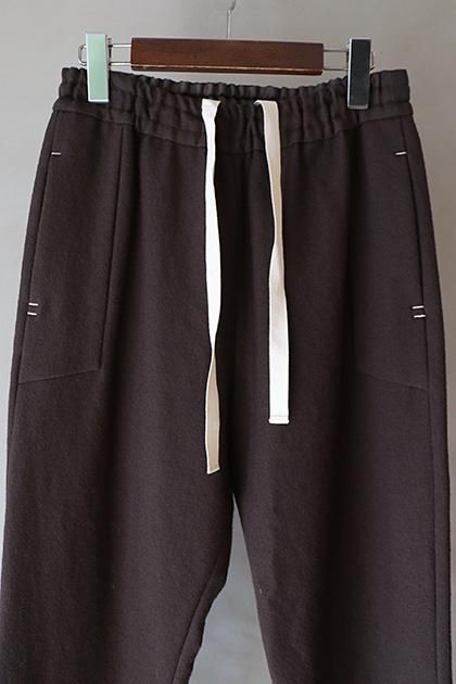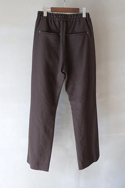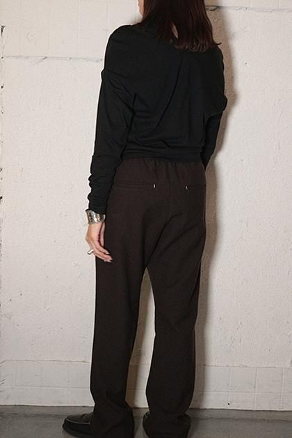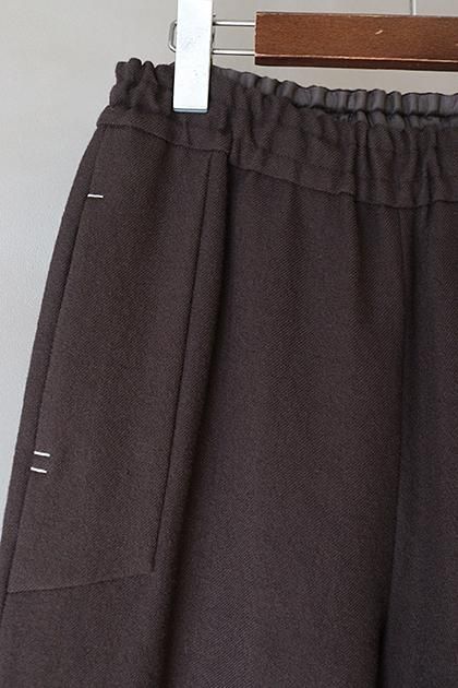 仕上げにはウールでは珍しい近江晒(おうみざらし)を施し、独特のシワ感と柔らかさをプラス。ウエストはゴム仕様でリラックス感を保ちながら、センタープレスでクラシカルな美しいシルエットに。内側の紐でサイズ調整も可能。