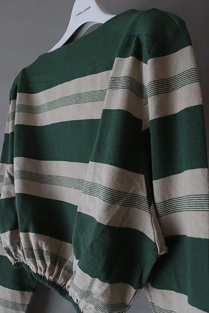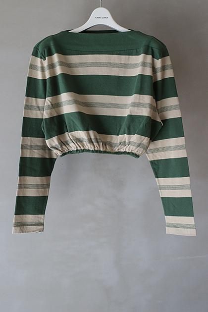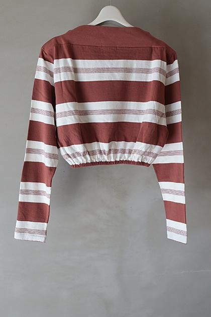 ヴィンテージライクな粗野さのあるコットン糸を使用したオリジナルのボーダー柄生地で作るクロップド丈のロングスリーブT-シャツ。リブ素材をワイルドに切り替えた立体感のあるボートネック。