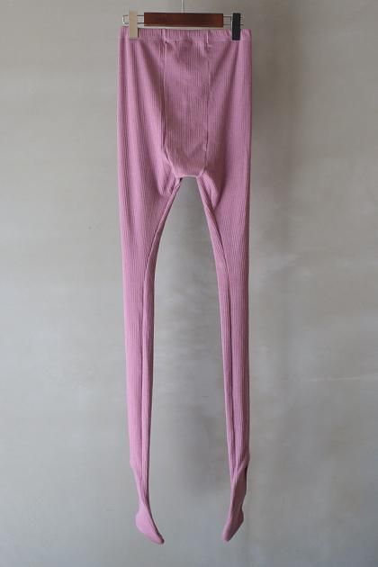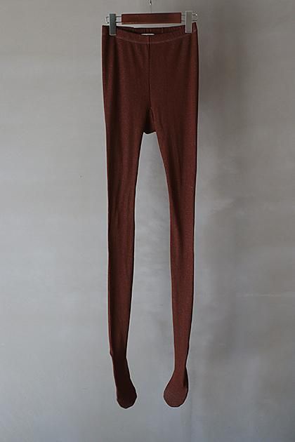 ウールとポリエステルを用い暖かさと軽さ、染色濃度の違いによって奥行きのある表情が特徴の針抜きジャージーを使用したタイツ。足裏にウレタンパットのインソール付き。