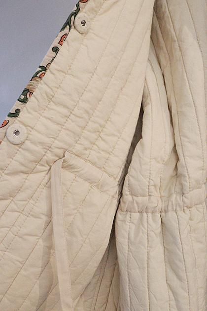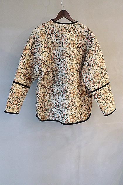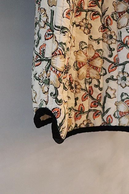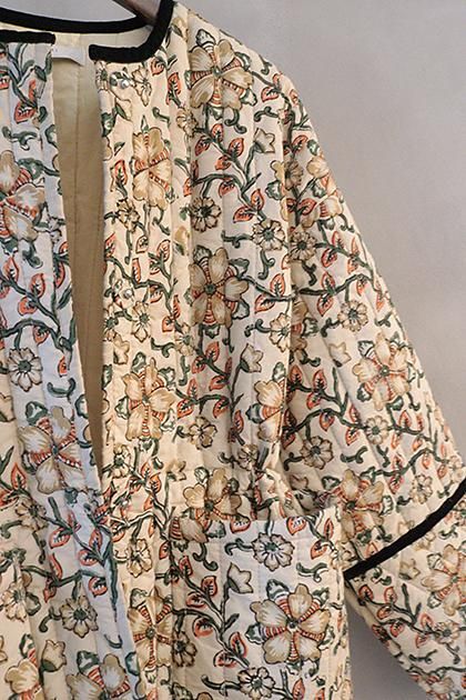 インドの伝統工芸であるブロックプリントの生地を、ふっくらとしたキルティング仕立てに。ゆったりとしたオーバーサイズで、重ね着もできるジャケットです。コーディネートの主役になるような存在感がありながら、ベロアのパイピングで全体を上品にまとめています。