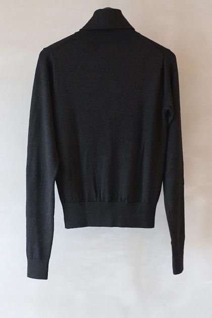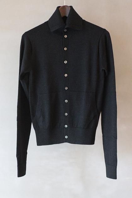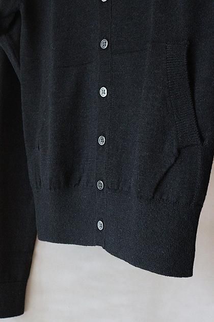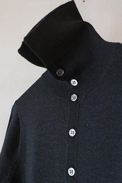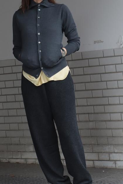 ポロ型のニットカーディガン。フロントのポケットのディテールがパーカーのよう。