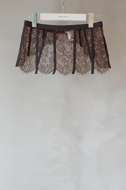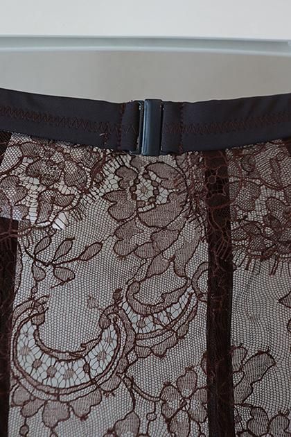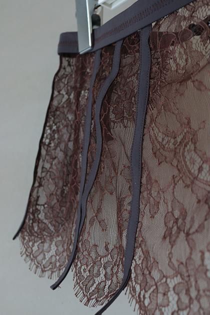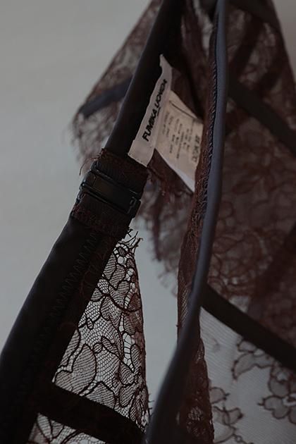フランス製の卓越したクラフトマンシップを感じるコットンリバーレースを使用したウエストベルトはナイロンジャージー素材で切り替えた、ラグジュアリーかつアクティブなデザイン。フロントスライドホックでの開閉。