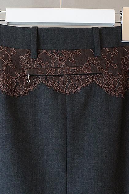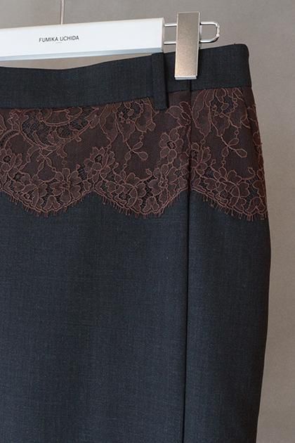 ウエストベルトの下に配されたリバーレースディテールが、トップスとの境界にニュアンスを⽣み出す役割に。