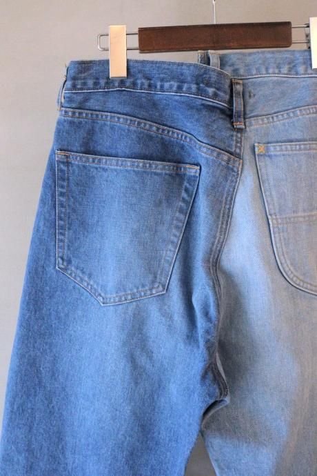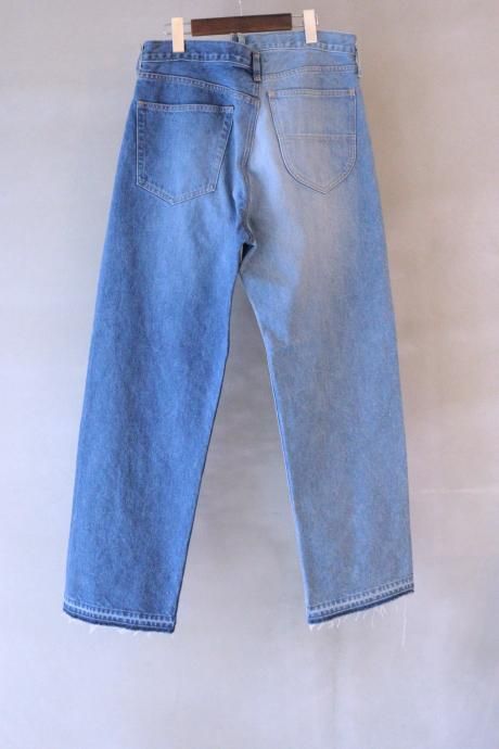 素材は7/-×6/-の弱ムラ糸を使用した13.5〜14OZデニム。インディゴはピュアインディゴの濃色と中濃色をを組み合わせ、左右で色味の違うUSED加工感に仕上げております。アメリカで誕生したデニムの歴史を紐解き、NEPHEWSの新たな解釈を加え製作されたデニムパンツ。左右異なる歴史を持ったデニムパンツをドッキングさせたデザインとなっており、異なる加工を行うことにより色落ちのコントラストを楽しむことができる。80sのデニムをリファレンスにナローシルエットとなっており、革靴からスニーカーまで幅広くスタイルングすることができる。