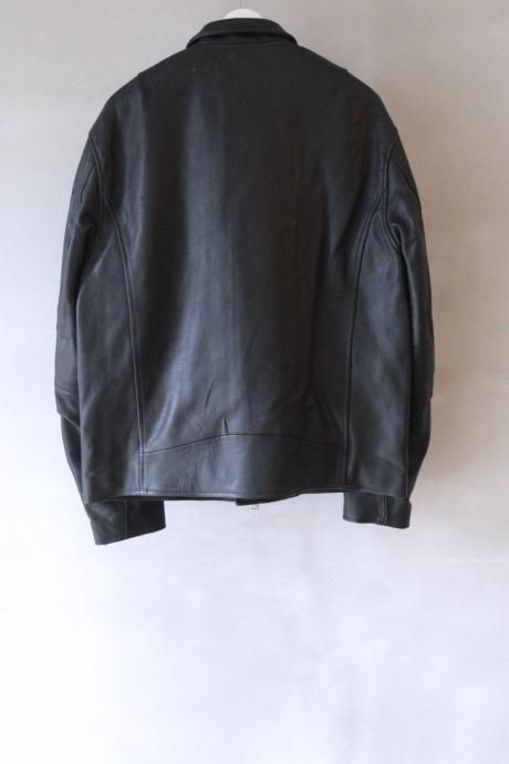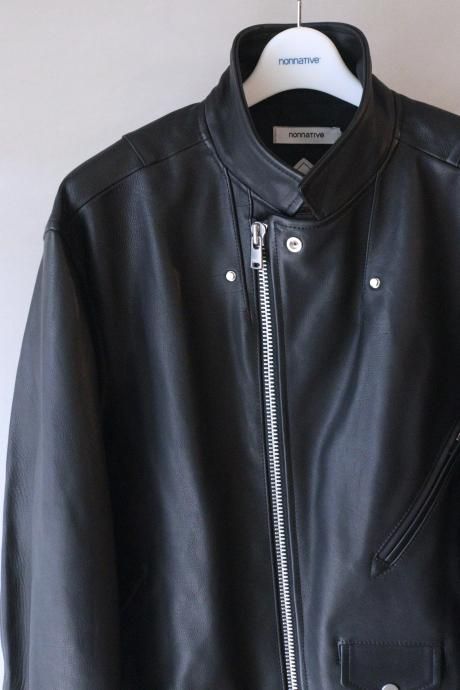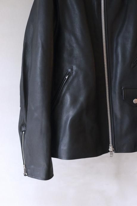 ややシボ感のあるカウレザー素材を使用したダブルライダース型のブルゾンです。一般的なダブル型とは異なり、センターからやや斜めに配されたファスナー位置で、着用がしやすいデザインです。