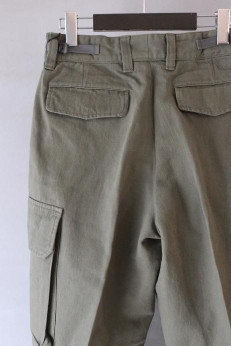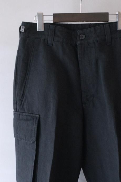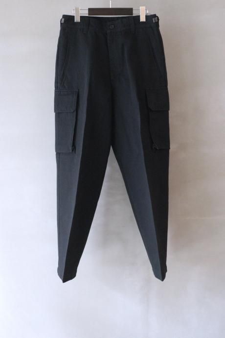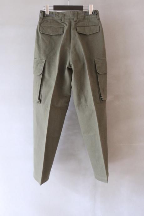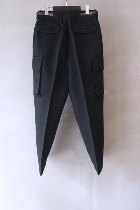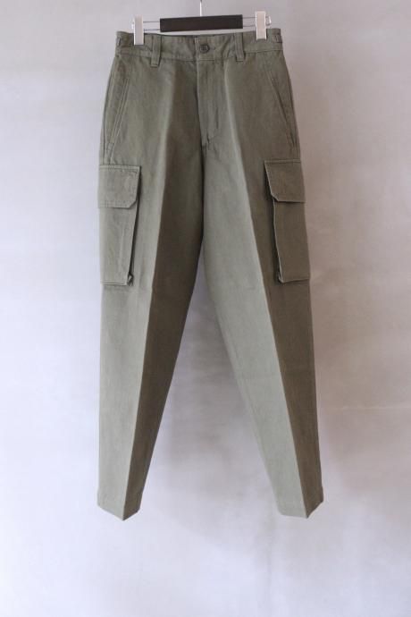 一見、フランス臭のするカーゴパンツですが、カーゴポケット付近からスラックスパターンで仕上げ、ステッチや裾のアジャスターなどミリタリー要素を薄くすることで、土臭さと上品さが混在する現代的なミリタリーパンツが完成しました。
