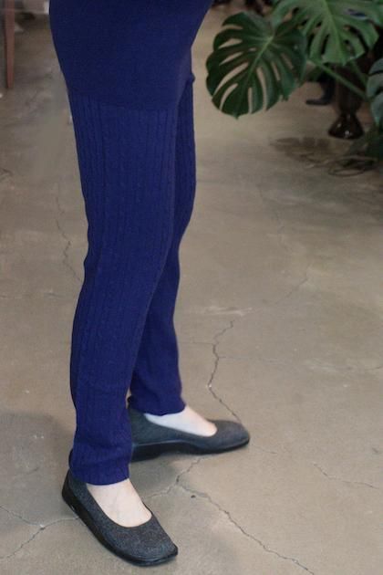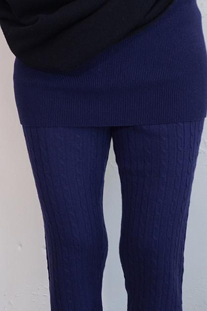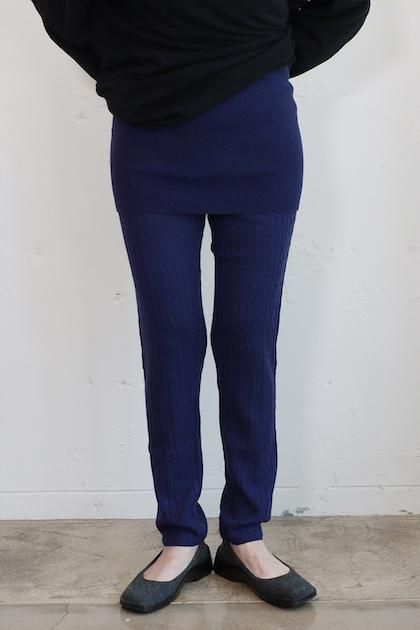 すっきりとしたハイゲージのケーブル編みが美しいレギンス。 ウエスト部分は折り返して腹巻のようにも使え、ヒップ周りを カバーしてくれる、大人の女性に嬉しいデザイン。 伸ばして着用すれば、スタイリッシュなハイウエスト風にも。 足首まで続くケーブル編みで、きれいめな着こなしにも、カ ジュアルなこなしにも絶妙にマッチします。ありそうでなかっ た、ニュータイプのレギンス。秋冬のスタイリングをブラッシュ アップさせる秀逸アイテム。